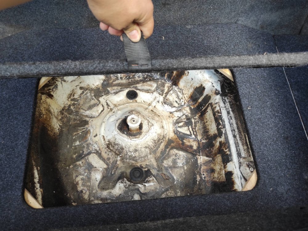 пол в багажник из толстой фанеры с люком под докатку, боковины отгибаются на петлях